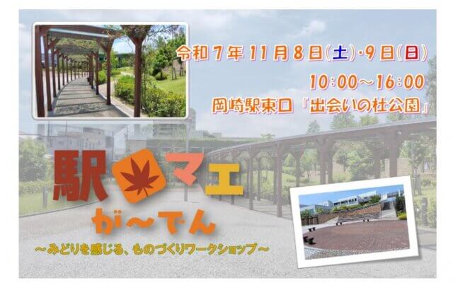 [引用:岡崎おでかけナビ] イベント情報です。 岡崎駅近くの出会いの杜公園にて、「駅マエが〜でん」が開催されます。 緑とものづくりを楽しむ体験ワークショップ [引用:岡崎おでかけナビ] 2025年1 ...