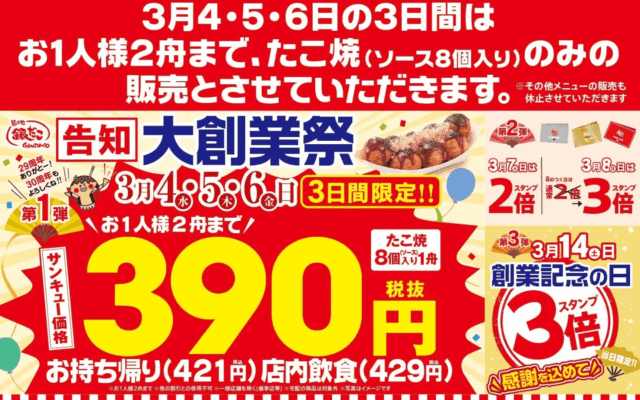 キャンペーン情報です。 銀だこ大創業祭が開催されます。 A.Kさま 情報提供ありがとうございました! 銀だこ大創業祭がまもなくスタート! 2026年3月4日(水)5日(木)6日(金)の3日間、たこ焼き ...