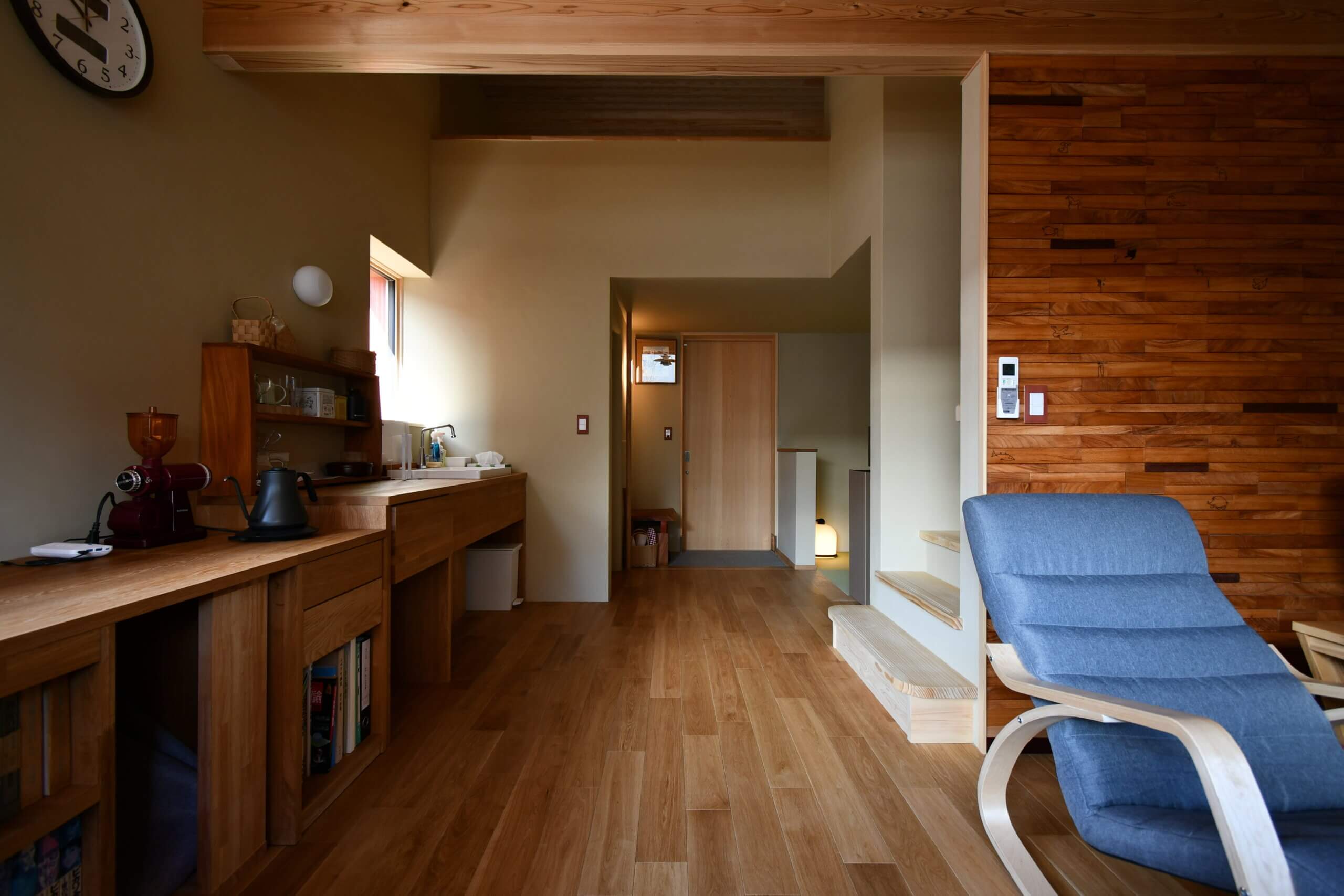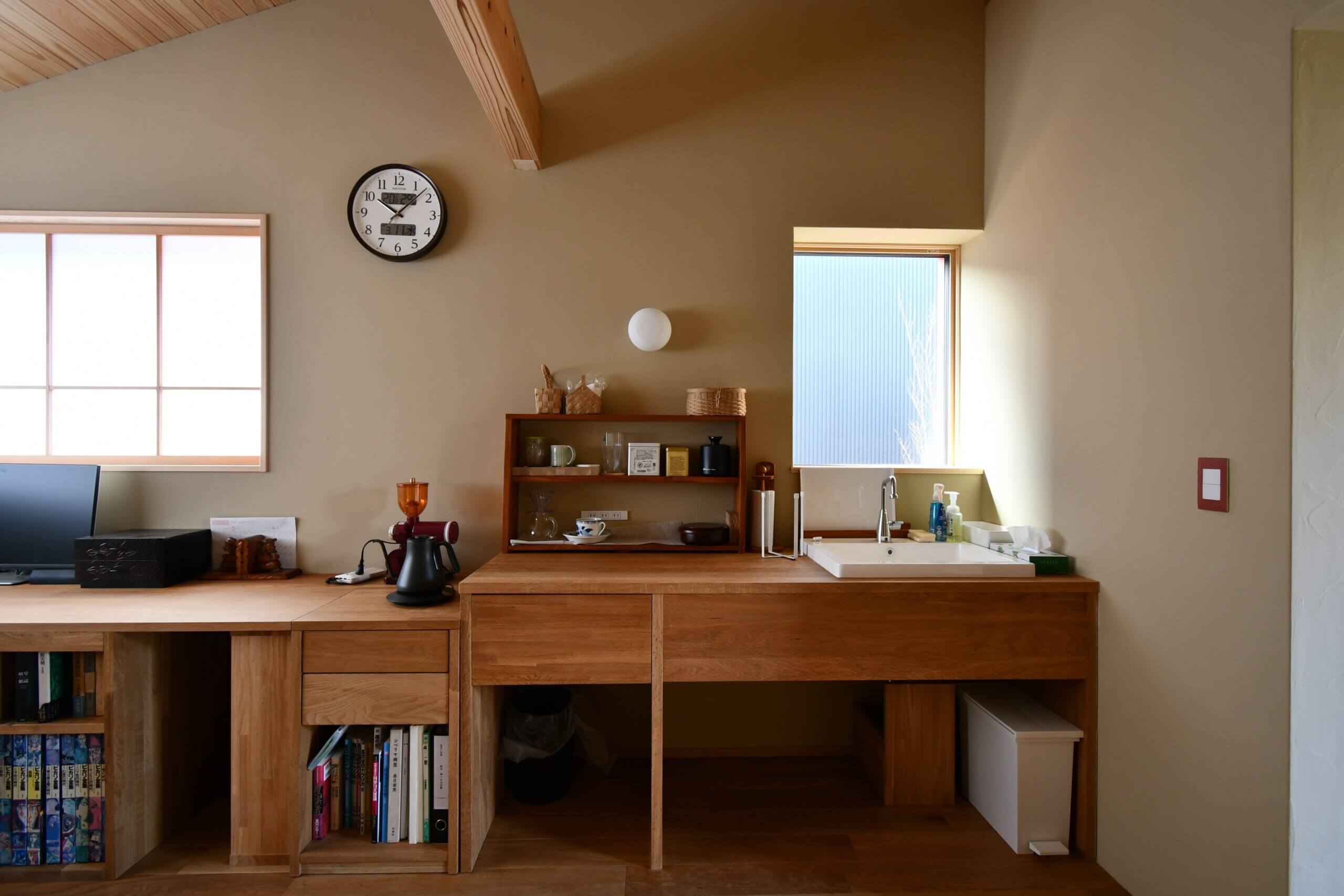 こちらの流し台や書斎カウンターは大工さんだけではなく、お施主さんも引き出しなど、DIY作業をしてつくりました。