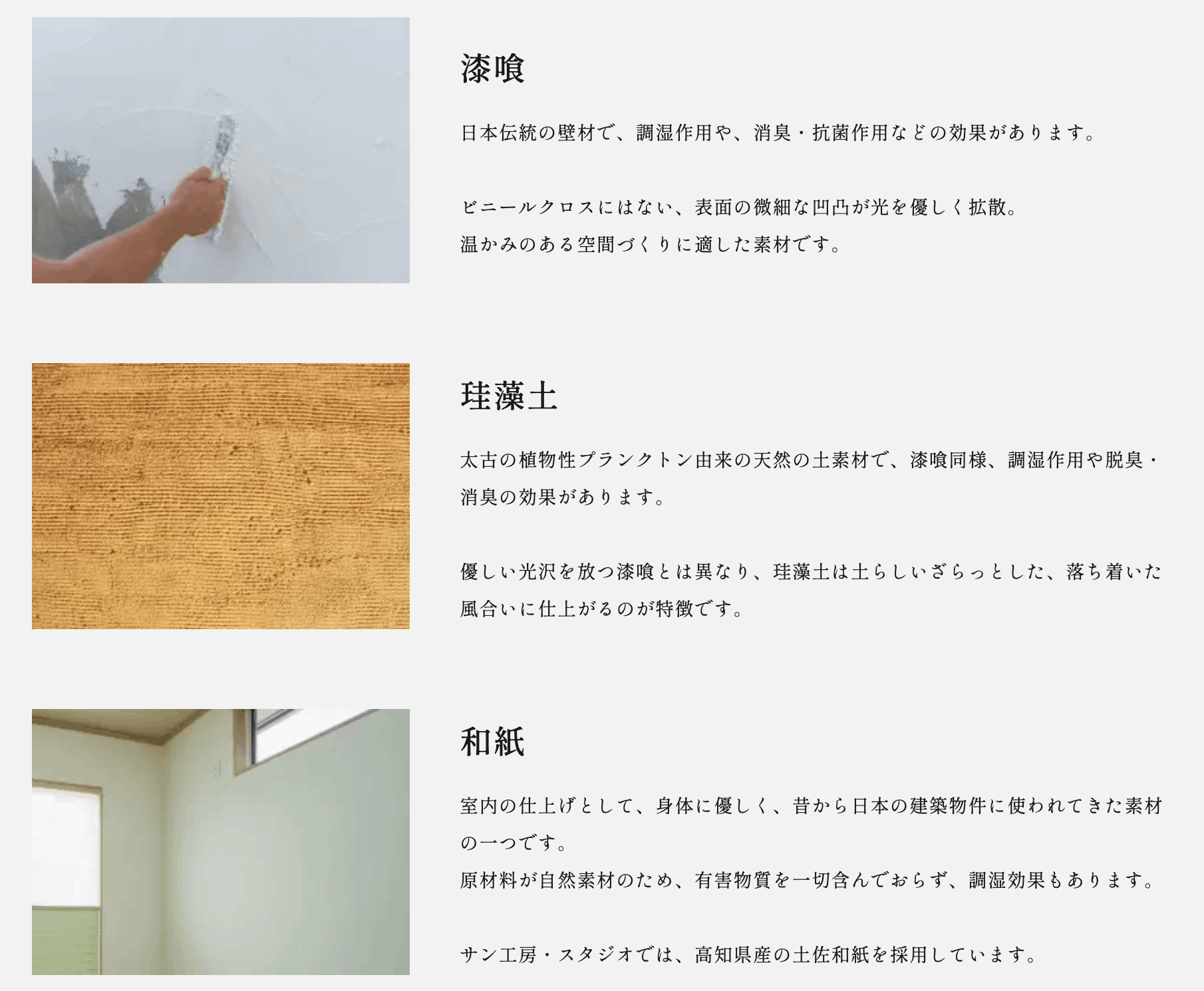素材としては、壁や天井には漆喰(しっくい)や珪藻土、和紙といった湿気を吸ったり吐いたりと呼吸をする健康に良い自然素材を使用。