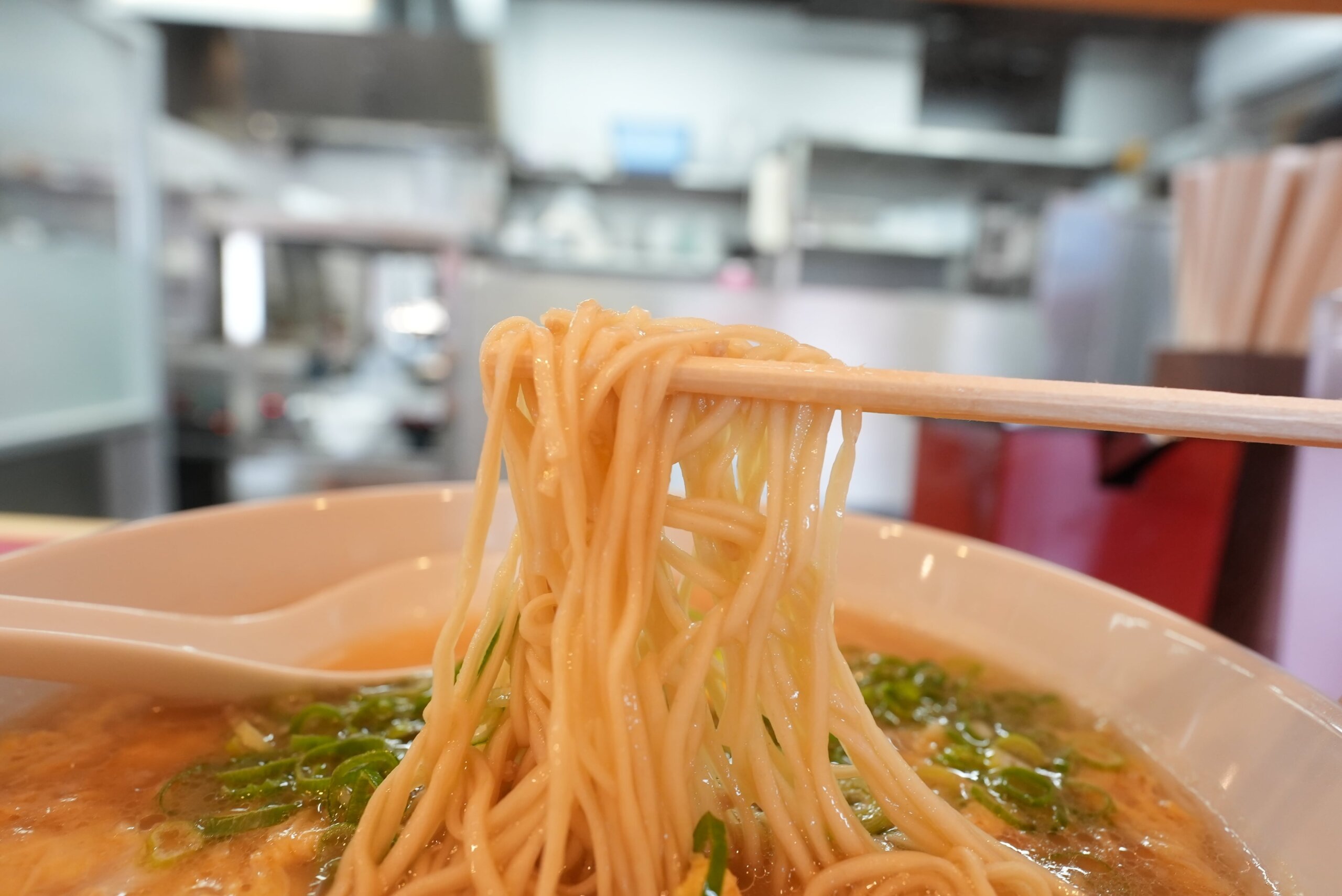 小麦ストレート麺がしっかりスープに絡みとっても美味しいです。
