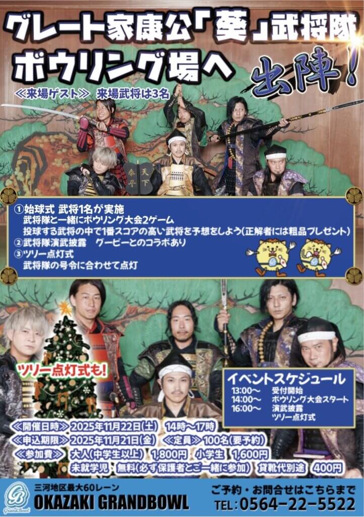 2025年11月22日(土)岡崎グランドボウルにて「葵武将隊と一緒にボウリングができるイベント」が開催されます。