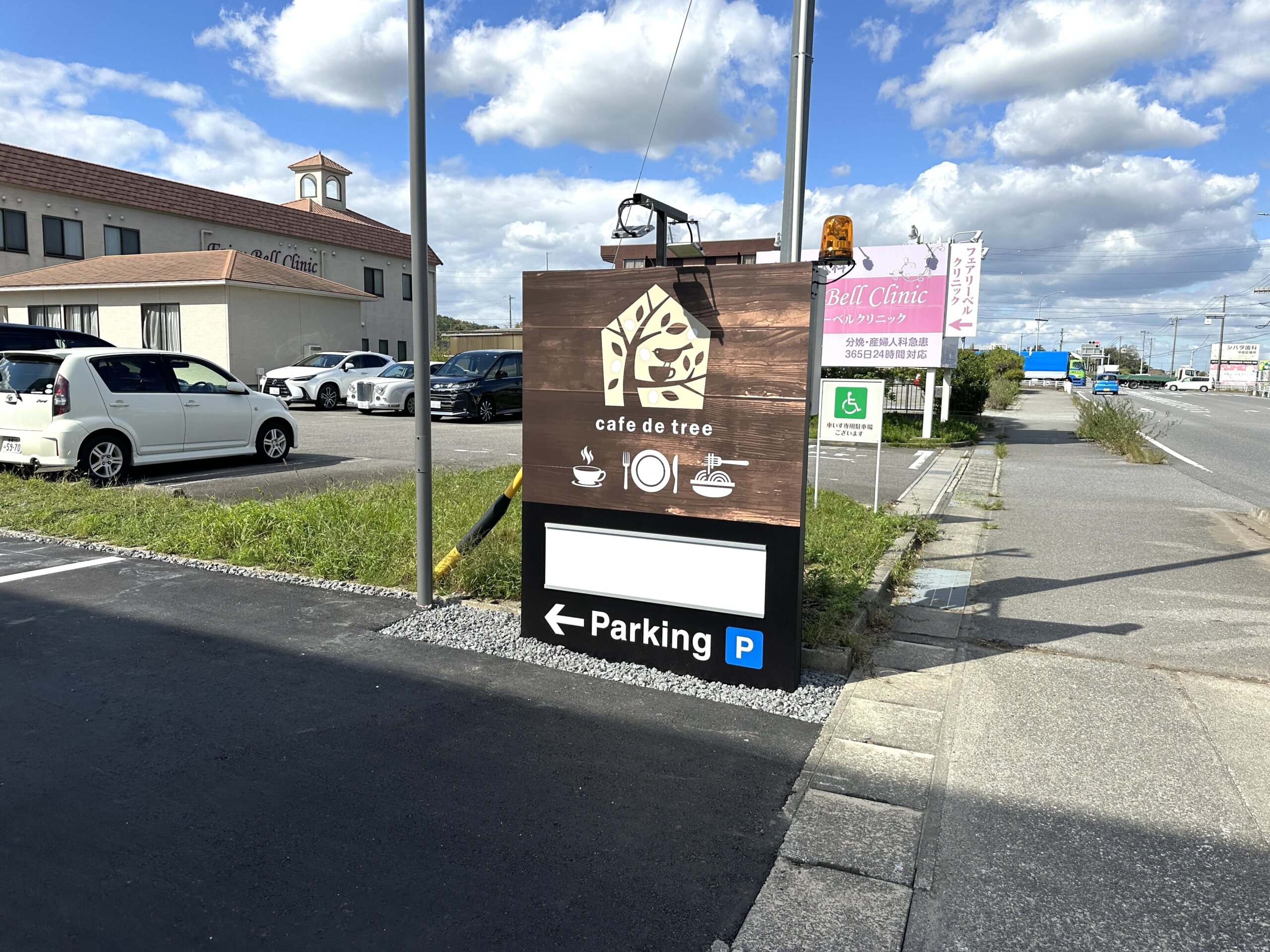 可愛らしい木の絵で駐車場への案内があります、店内の様子が気になりますね!