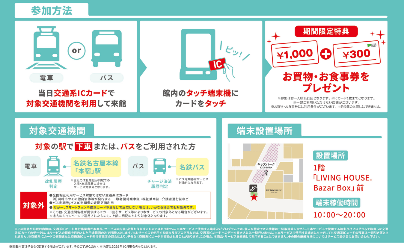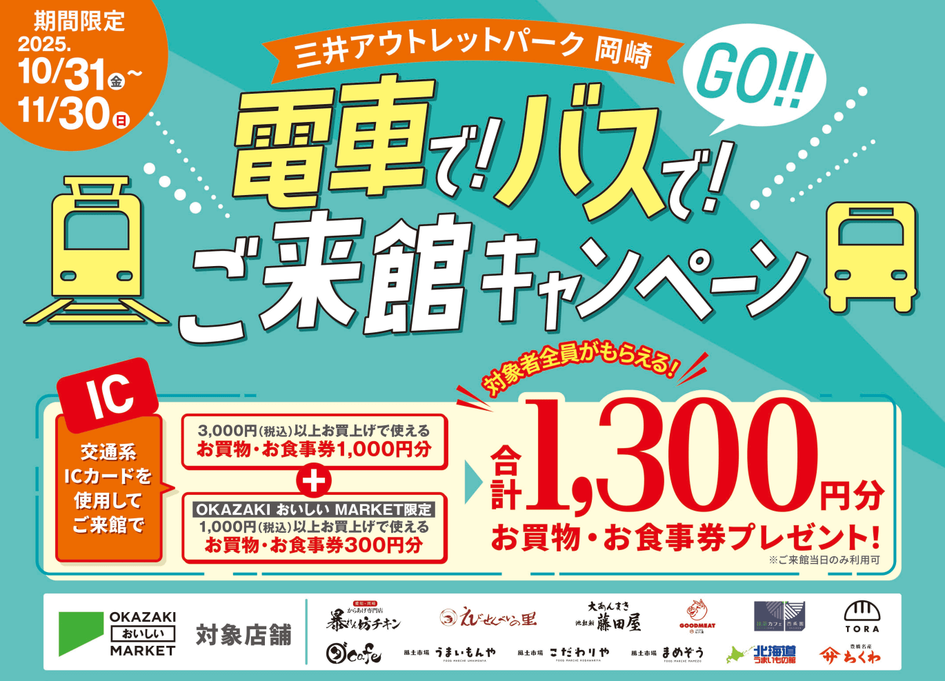 車ではなく、交通系ICカードを使用して「電車」「バス」で来館すると「3,000円以上(税込)お買い上げで使えるお買い物・お食事券1,000円分」「OKAZAKI おいしい MARKET限定 1,000円(税込)以上お買い上げで使える お買い物・お食事券300円分」がもらえちゃいます。ららぽーと安城の開業時にもありましたが、結構お得なキャンペーンですね。