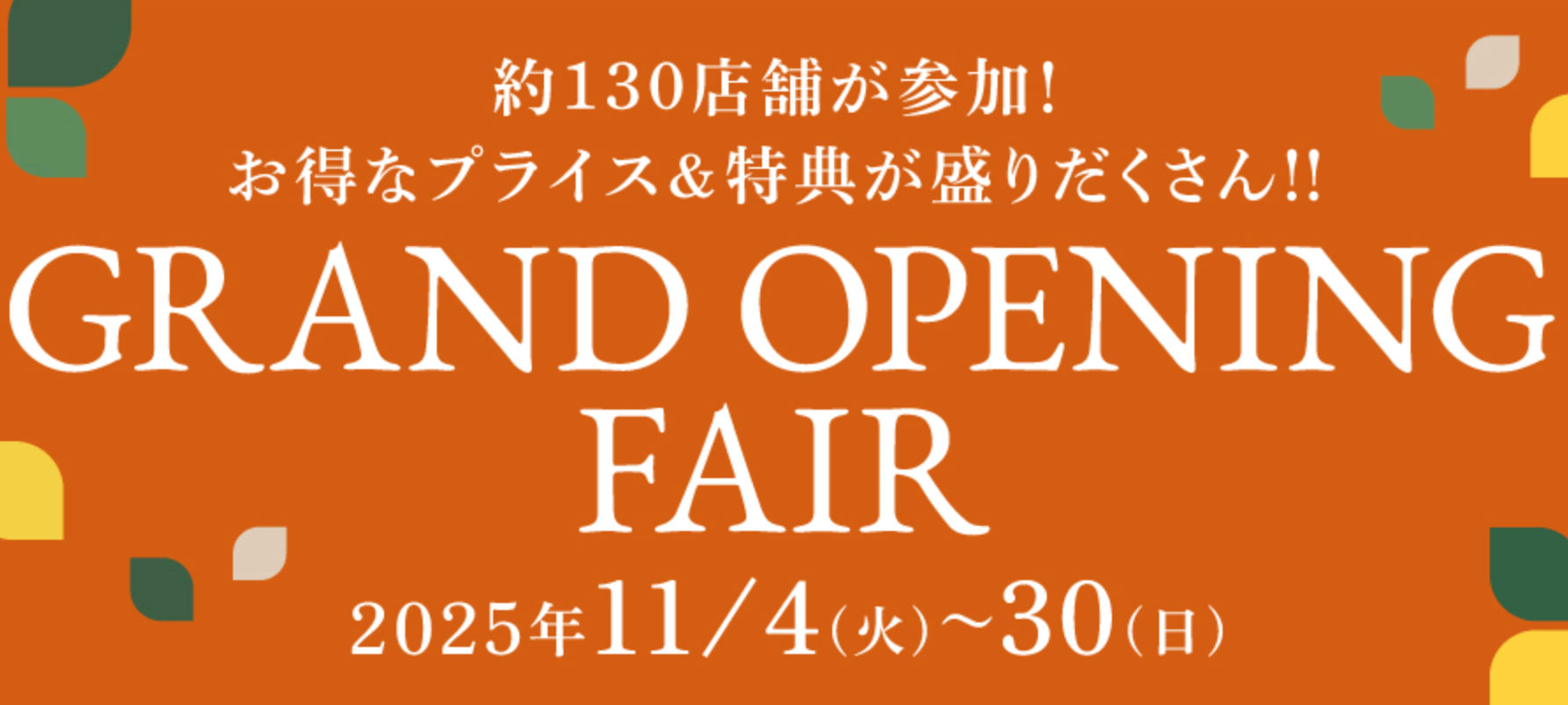 2025年11/4(火)~30日(日)までの期間、三井アウトレットパーク岡崎にて「GRAND OPENING FAIR」が開催されます。約130店舗でセールやキャンペーンなどが開催されます。