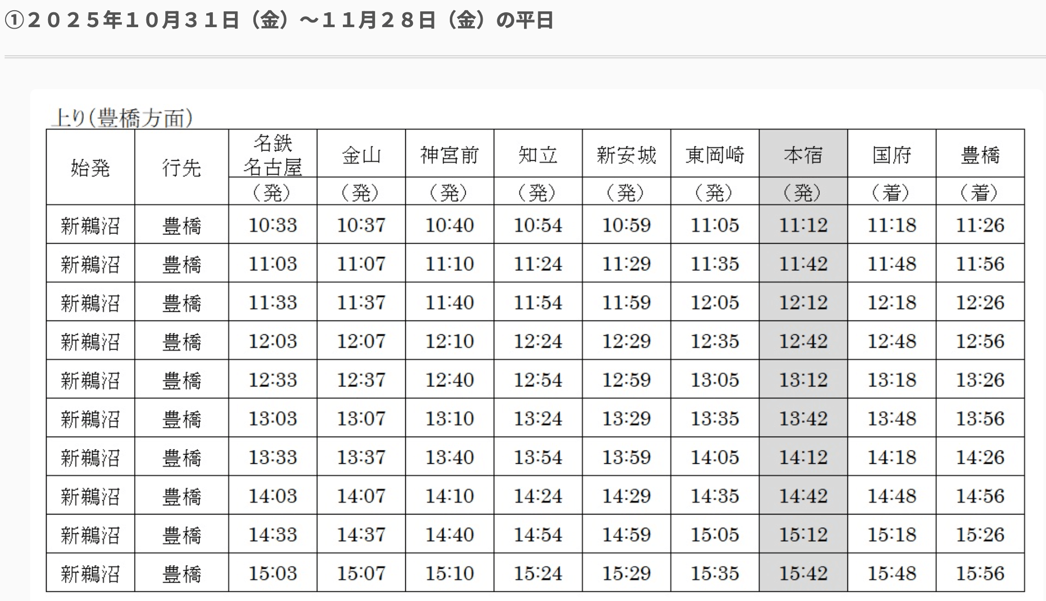 2025年11月30日までの期間、本宿駅に一部の「豊橋行 特急」および「名鉄岐阜行 特急」が臨時に停車します。