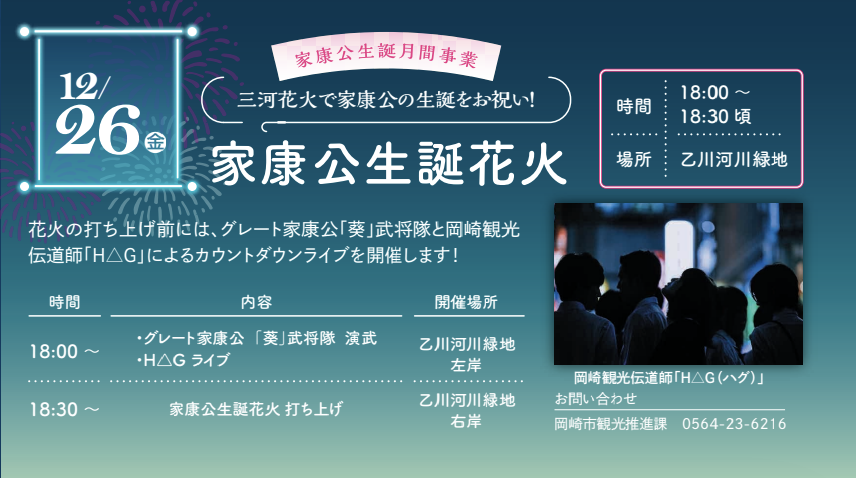 2025年12月26日(金)に、乙川河川緑地にて「家康公生誕花火」の打ち上げと、イベントが実施されます。