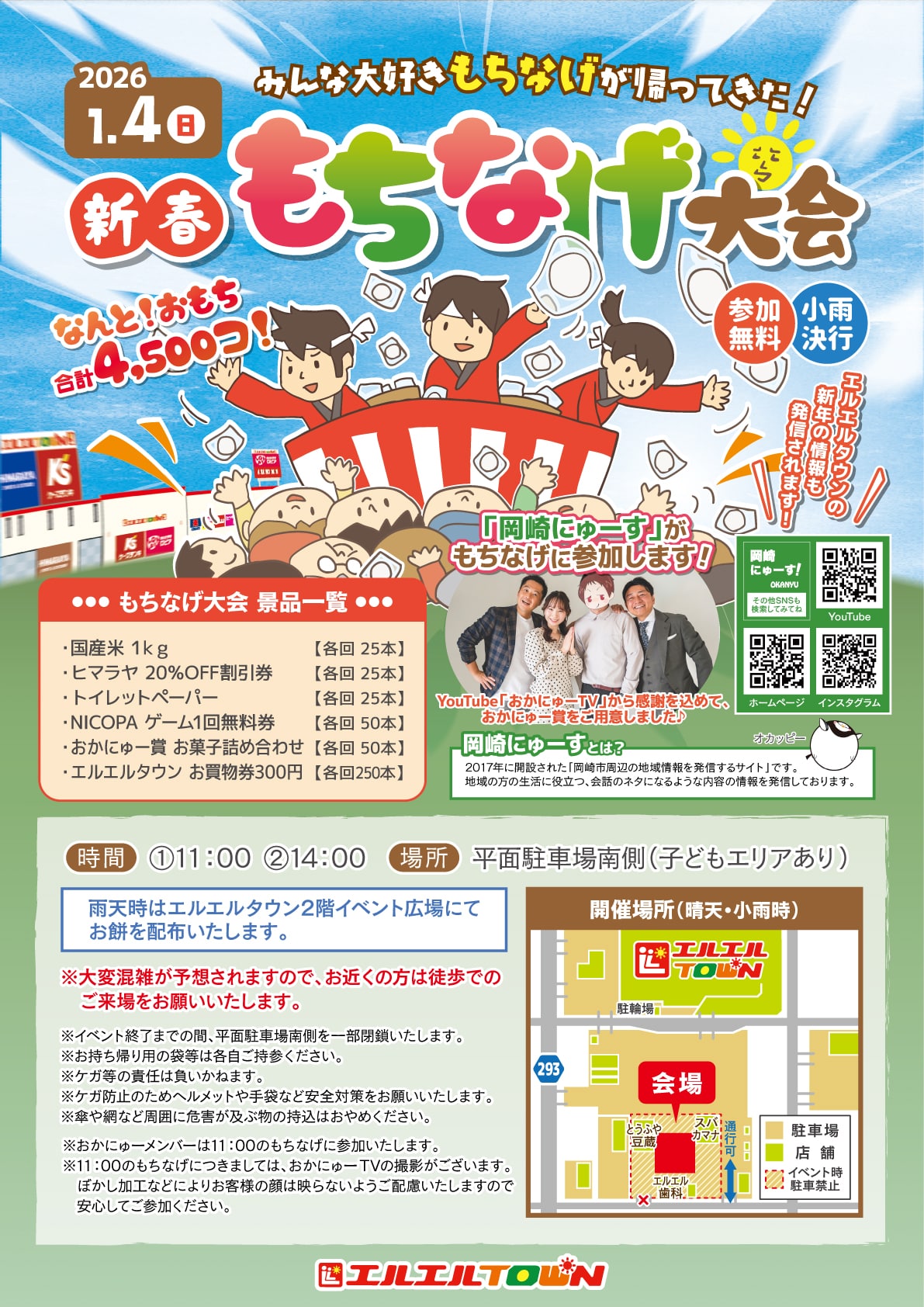 開催時間は11:00~と14:00~の2部制となっておりますので、ぜひお手隙の時間にエルエルタウンの餅投げにご参加してみてはいかがでしょうか。