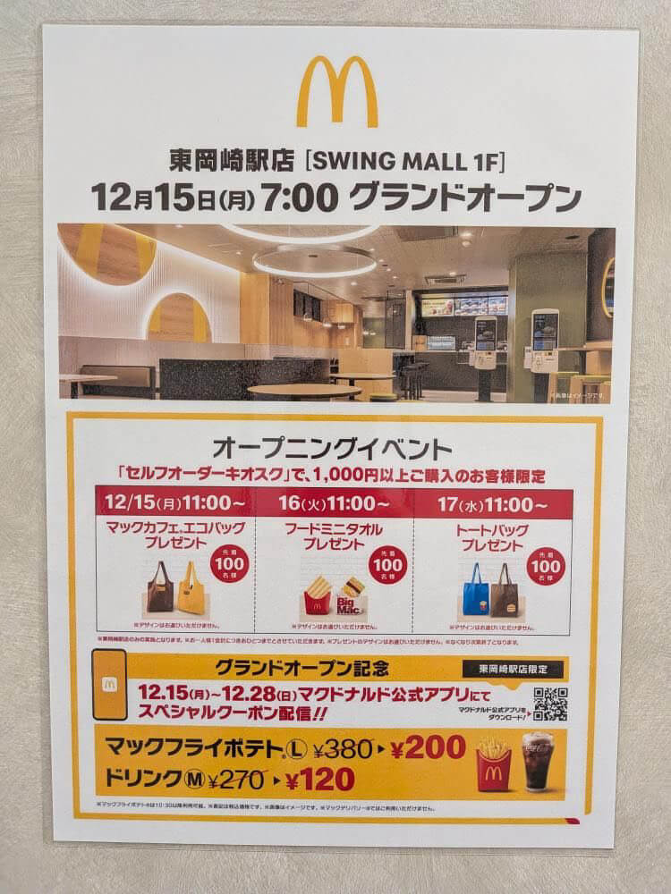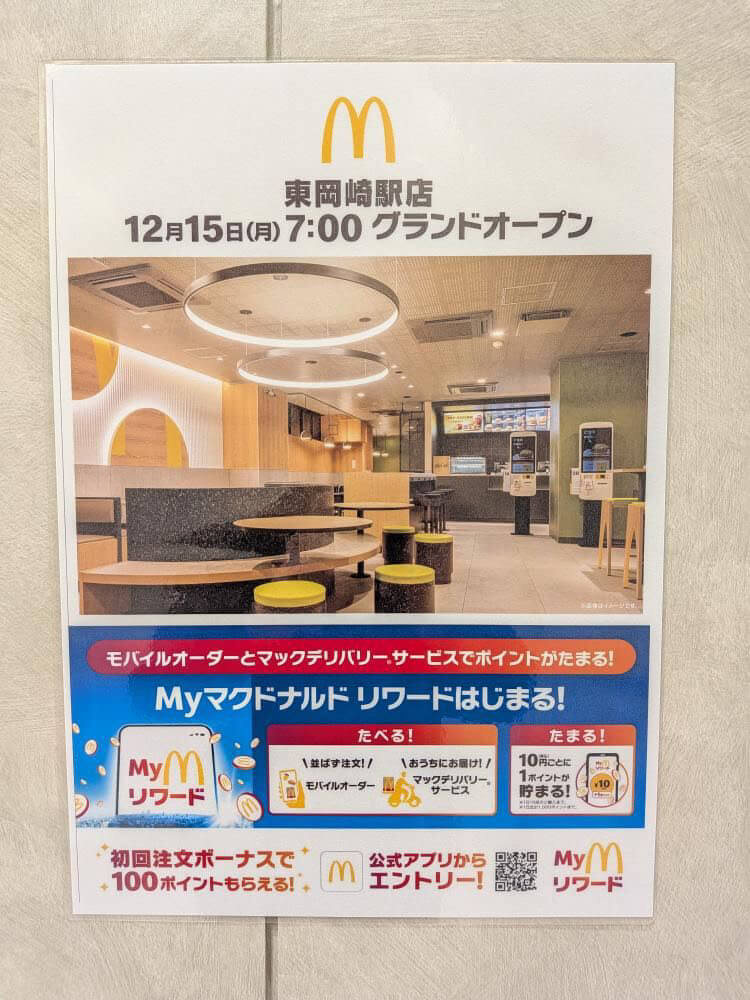 2025年12月15日(月)SWINGMALL1Fに「マクドナルド 東岡崎駅店」が開店予定です。