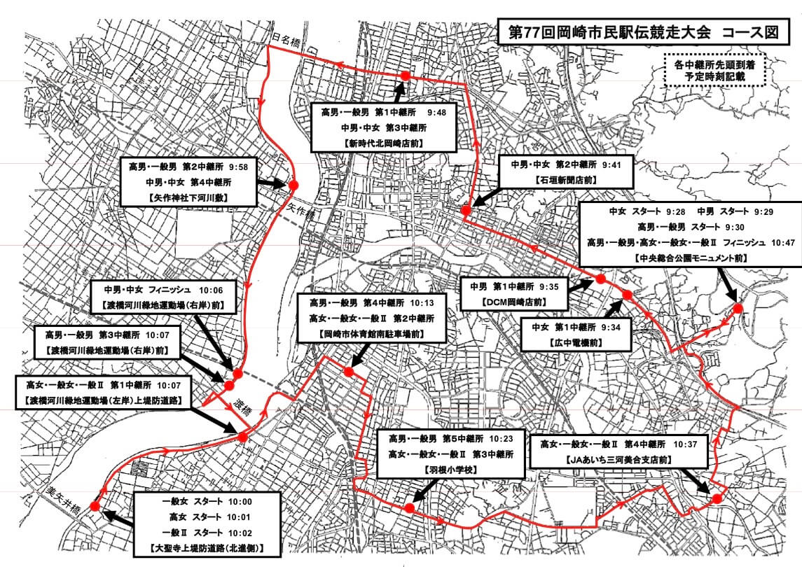 高校男子・一般男子の部は、中央総合公園をスタート後、北岡崎・矢作・羽根・美合を経由して市街地を大きく一周し、再び中央総合公園に戻ってフィニッシュのコースです。