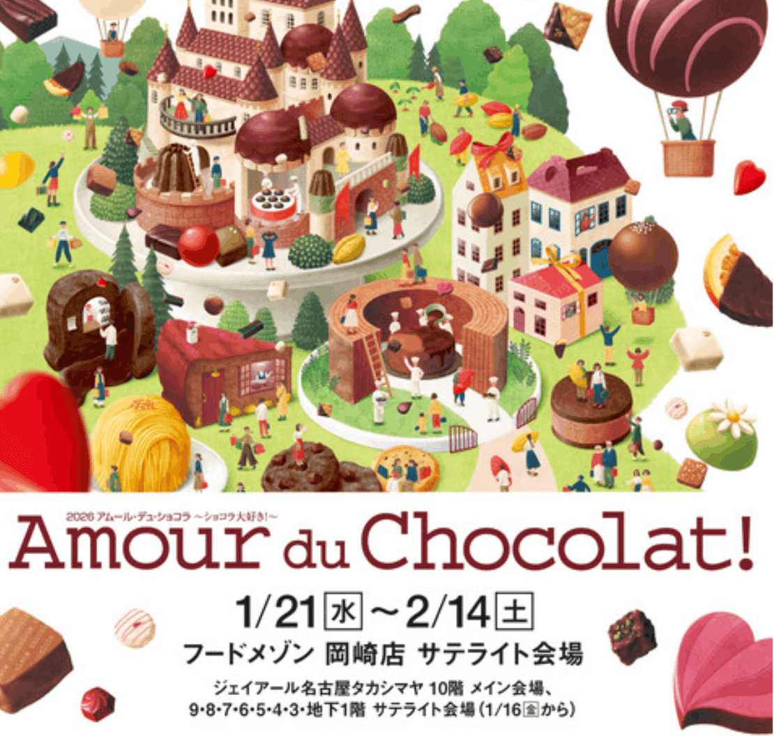 2026年1月21日(水)~2月14日(日)までの期間、ジェイアール名古屋タカシマヤフードメゾン岡崎店にて「2026 アムール・デュ・ショコラ」が開催されます。