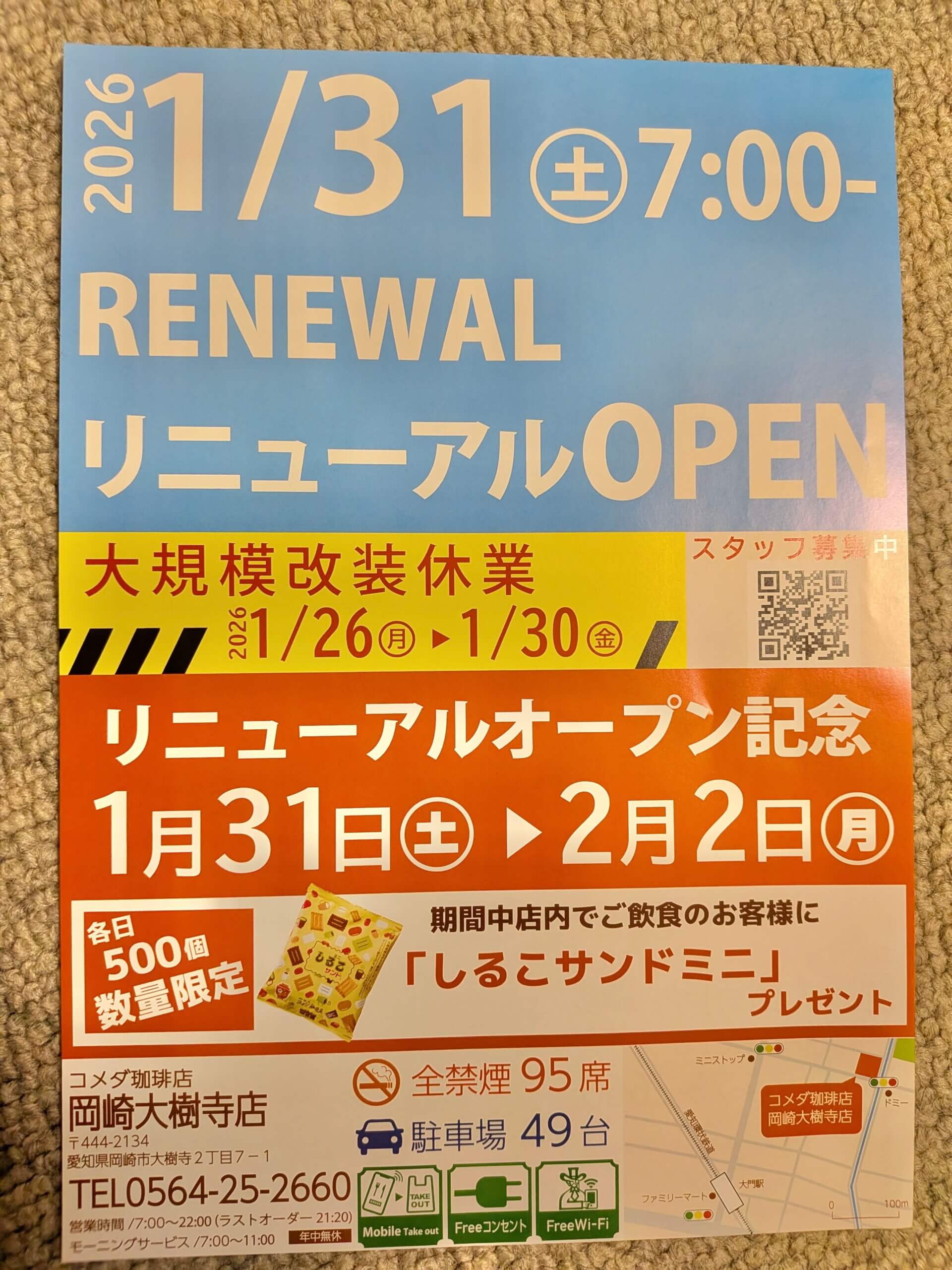 2026年1月26日(月)~30日(金)までの期間、岡崎市大樹寺2丁目の「コメダ珈琲店 岡崎大樹寺店」がリニューアルのため休業予定です。