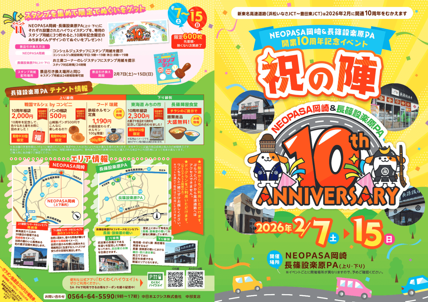 NEOPASA岡崎と長篠設楽原PAにて開通10周年イベントが開催されます。