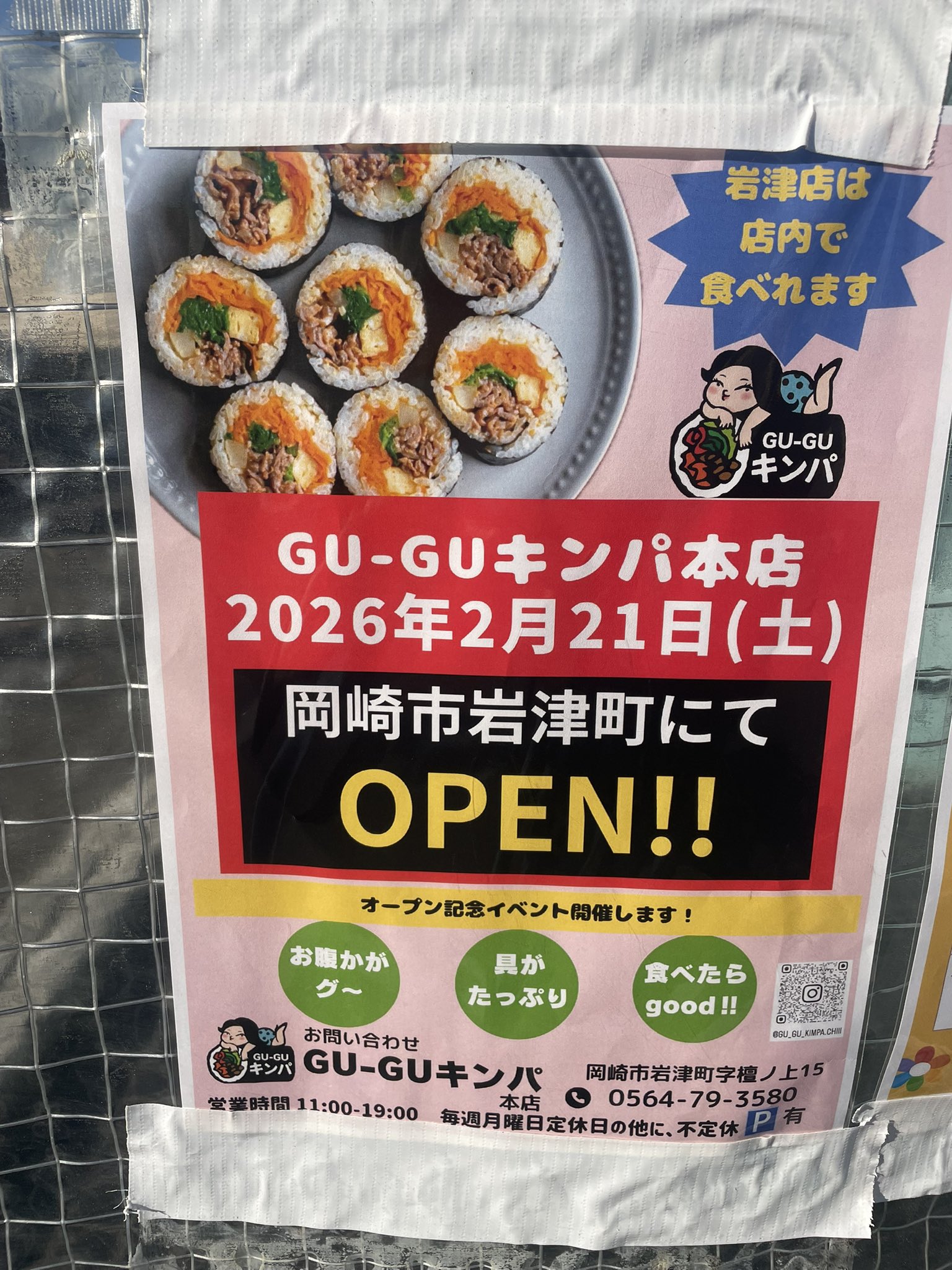 2026年2月21日(土)岡崎市岩津町に「GU-GUキンパ本店」が開店予定です。