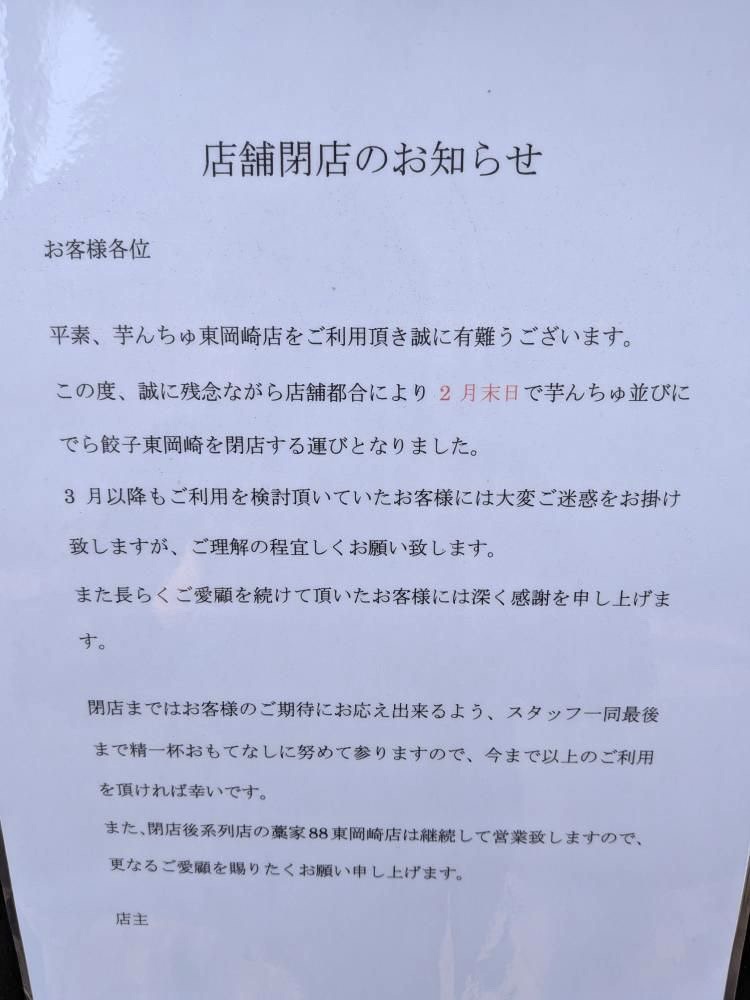 2026年2月末、東岡崎駅前にある「芋んちゅ東岡崎店」「でら餃子東岡崎」が閉店予定です。