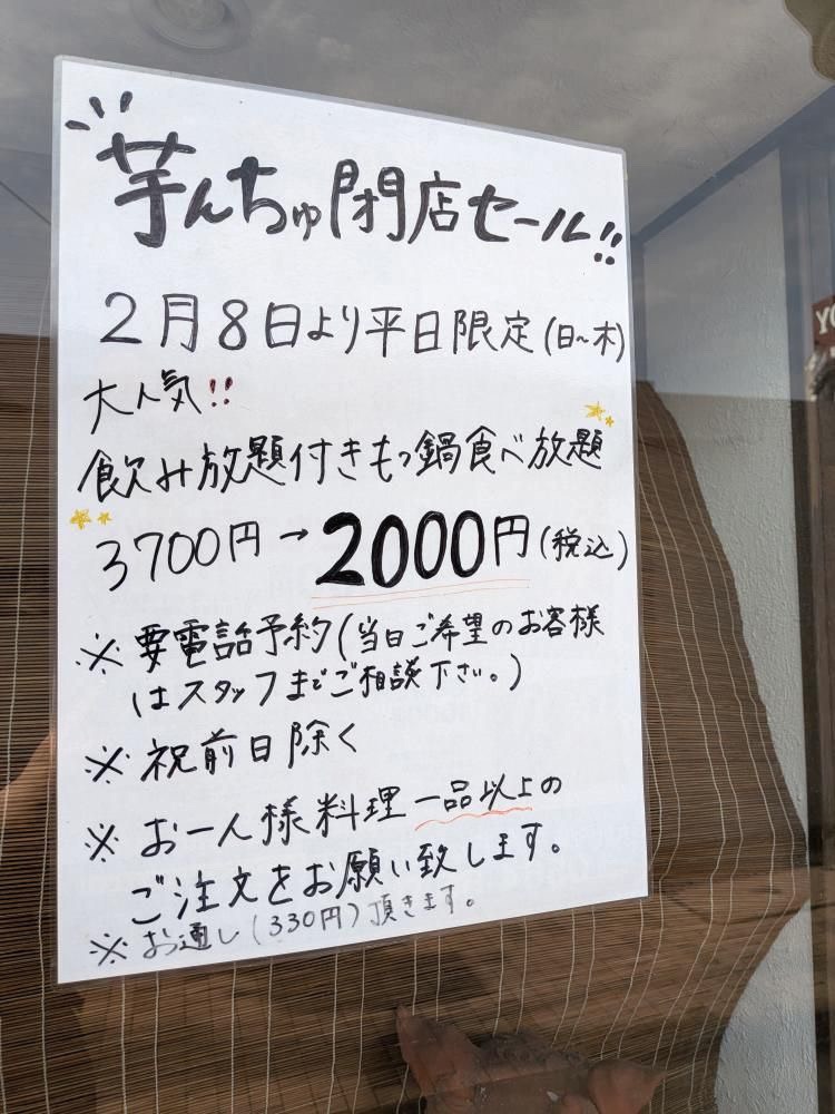 閉店に伴い、芋んちゅ東岡崎店の方では平日限定で飲み放題付きもつ鍋食べ放題を開催しているようです。