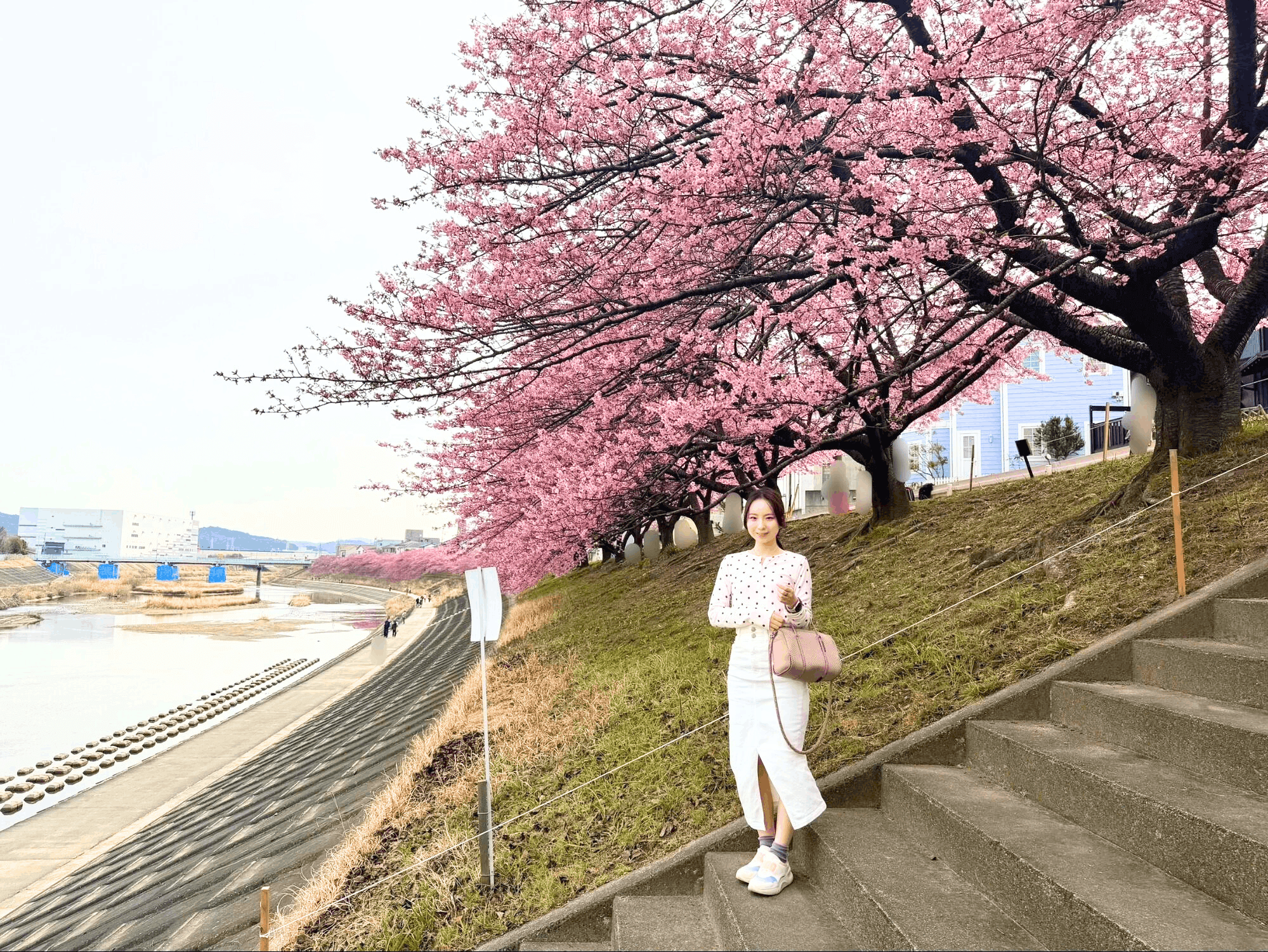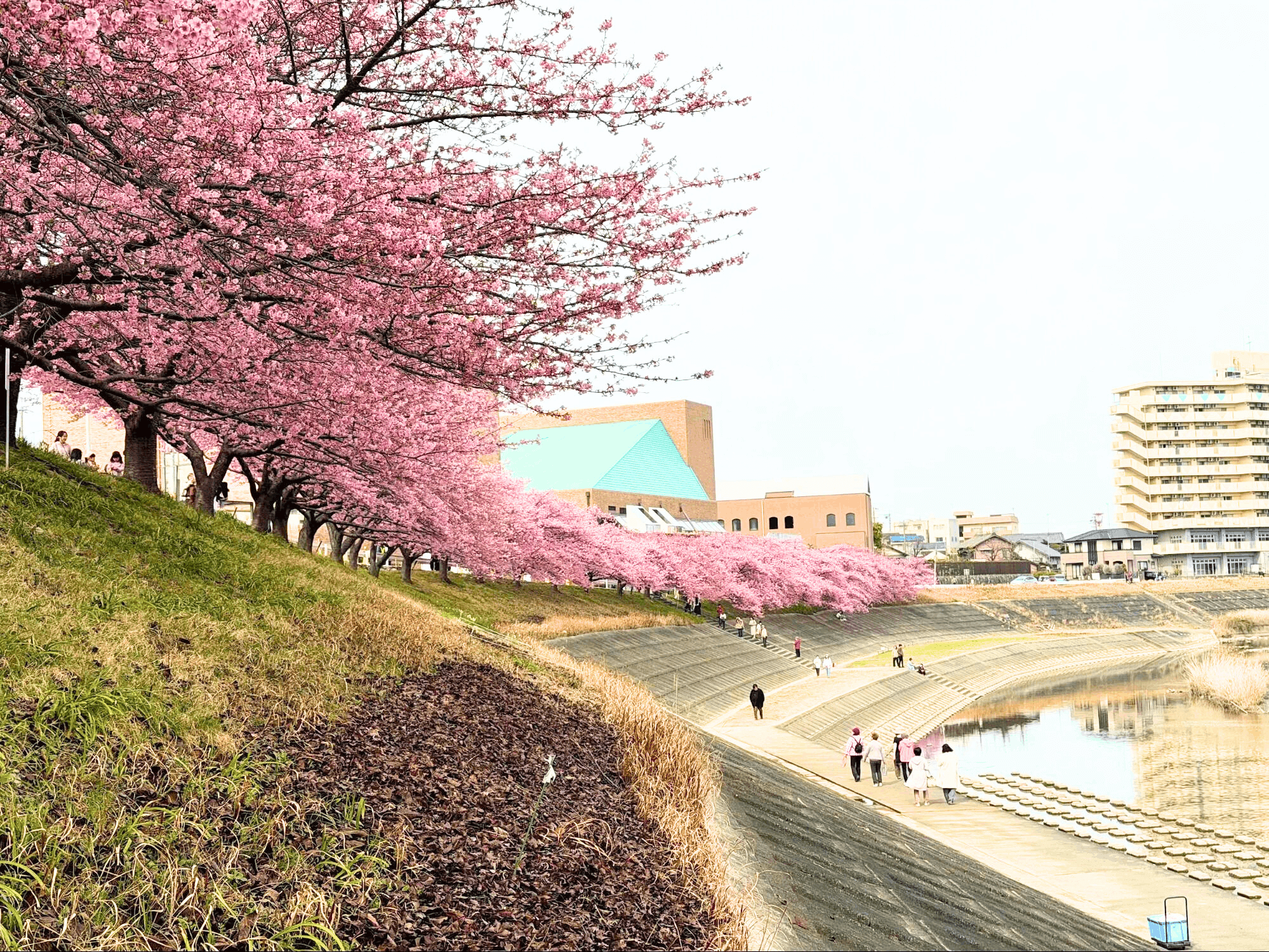 竜美丘会館側の乙川沿いに咲く河津桜、通称“葵桜”が見頃を迎えています。