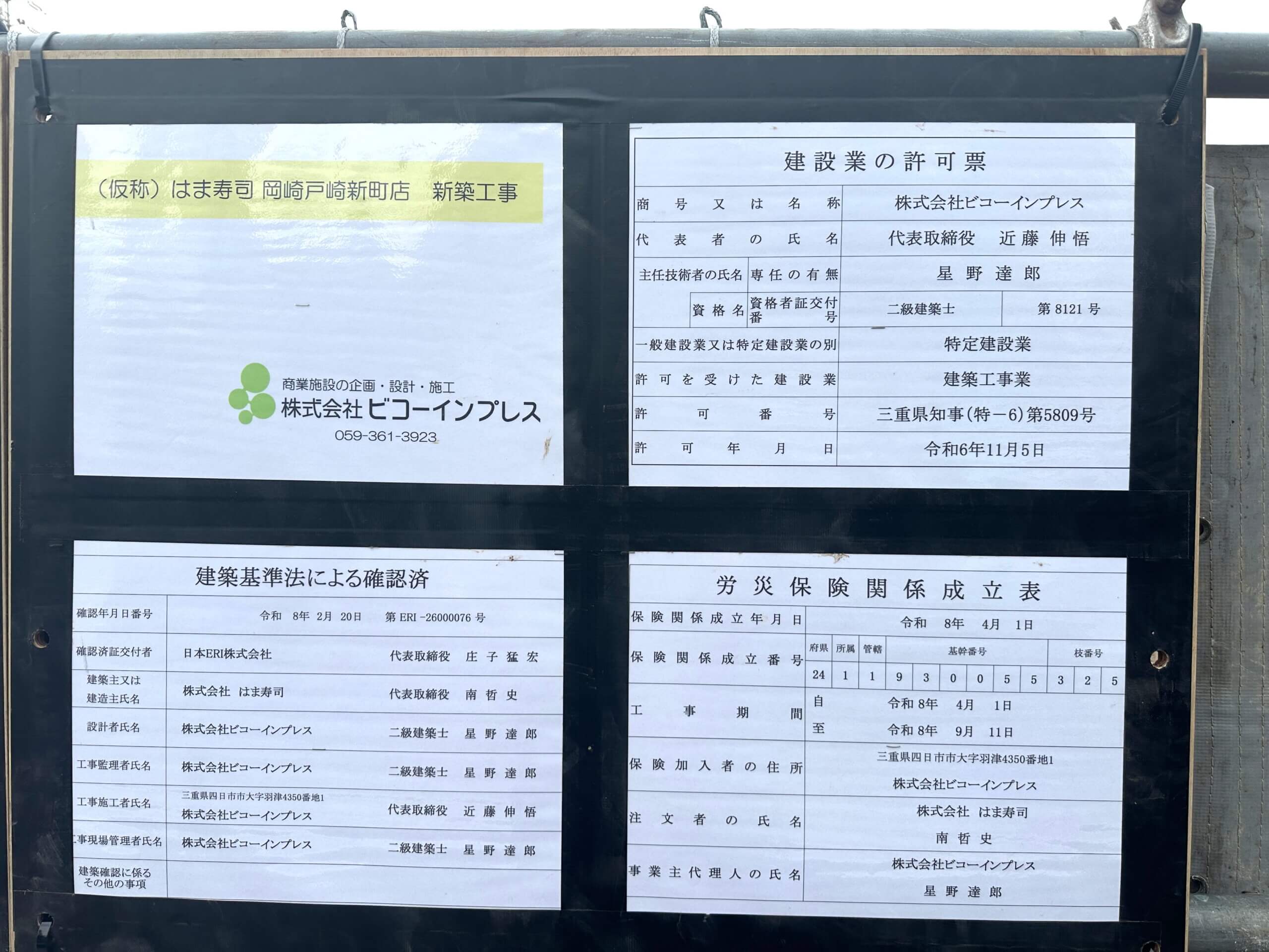 岡崎市戸崎新町の葵湯跡地の北側に「すき家岡崎戸崎新町店」「はま寿司 岡崎戸崎新町店」が開店予定です。